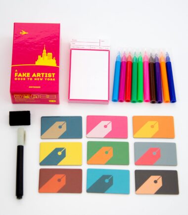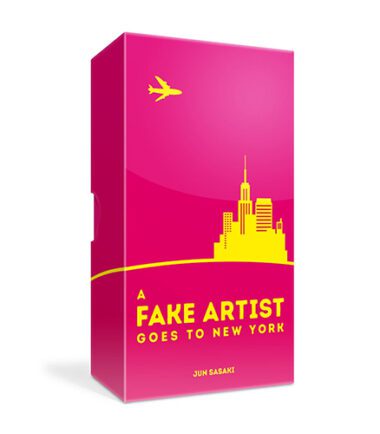 Fake Artist Goes to New York – is a party game for 5-10 players. Players take turns being the Question Master, whose role is to set a category, write a word within that category on dry erase cards, and hand those out to other players as artists. At the same