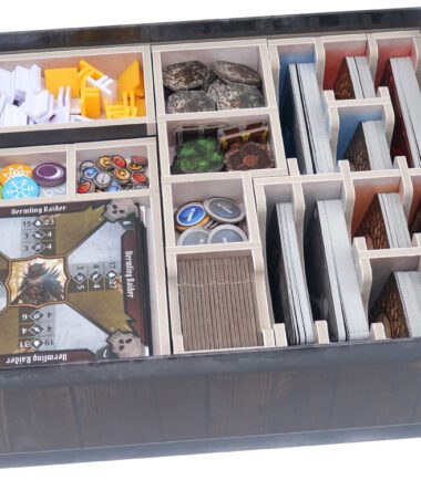 Insert compatible with Gloomhaven: Jaws of the Lion. The design provides both efficient storage and improved game play. Many of the trays can be utilised during the game, and they greatly aid set-up and clear-away times. The insert is arranged in three layers.