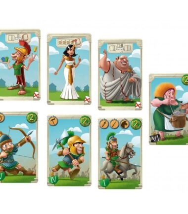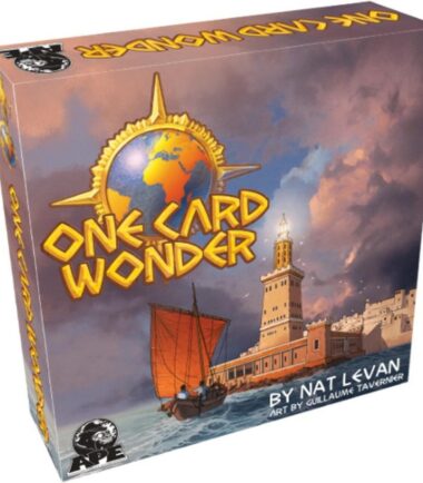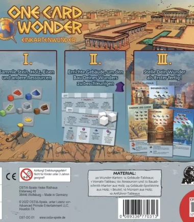 In One Card Wonder, each player receives a card that shows a wonder of the ancient world and a set of support buildings. The multiple stages of the wonder must be built from the ground up, while the buildings may be built in any order. Players have four worker meeples and