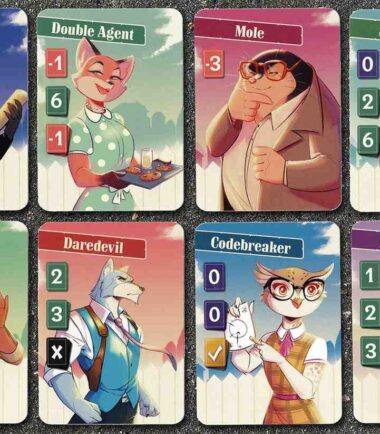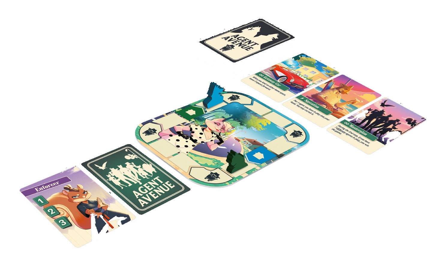 Agent Avenue is a competitive card game that combines bluffing, strategic set collection, and a race to uncover your opponent’s identity. Set in a colorful anthropomorphic world, players assume the roles of retired spies in a suburban neighborhood, outsmarting each other with cards that can score points or trigger special effects. The game’s art brings to life a quirky neighborhood of animal spies.