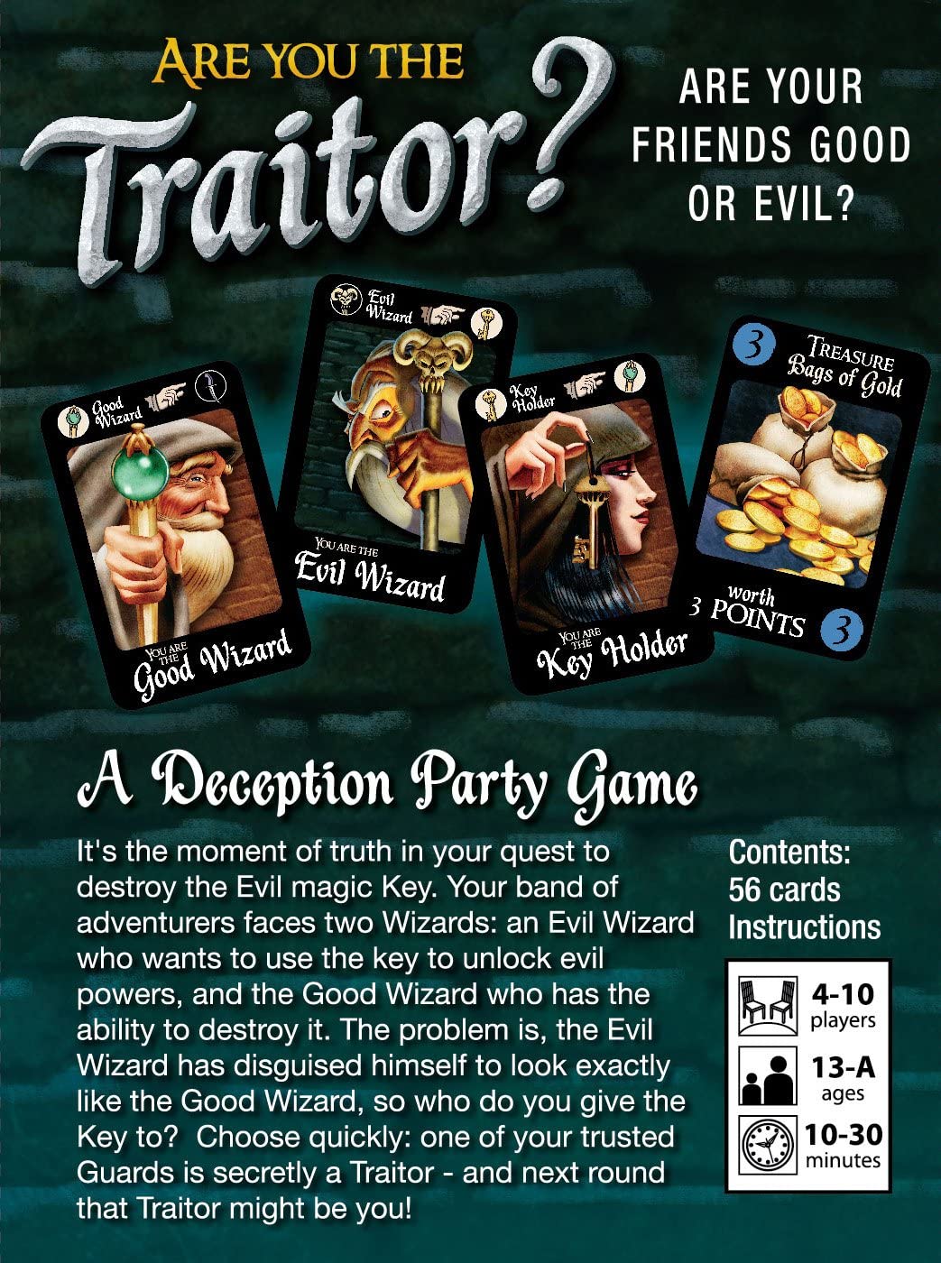 Are You the Traitor? is a secret role selection game akin to Werewolf/Mafia. One player is the Evil Wizard, attempting to obtain the Magic Key for nefarious purposes. Another player is the Good Wizard, trying to destroy the Key to keep it out of Evil hands. The other players support Good or Evil in various roles.