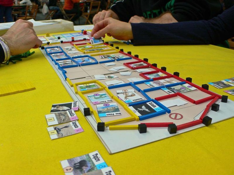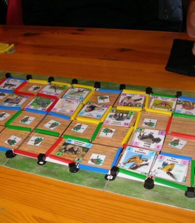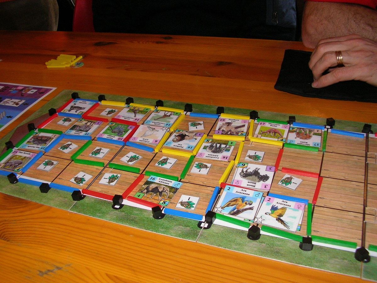 In the game, the players are Noah and his sons, and they must find the animal couples and load them on the Ark before the Flood starts. In each round, they will choose which action they will take: Searching for Animals; Collecting Wood, Food or Pitch; Building Corrals in their color; or Loading Animals on the Ark. This choice also determines the round order for the next turn. Players score points by loading animals in the right corrals, possibly in the player’s color. Thus, in each round there is a strategical phase (choose action) and a tactical phase (execute action).
