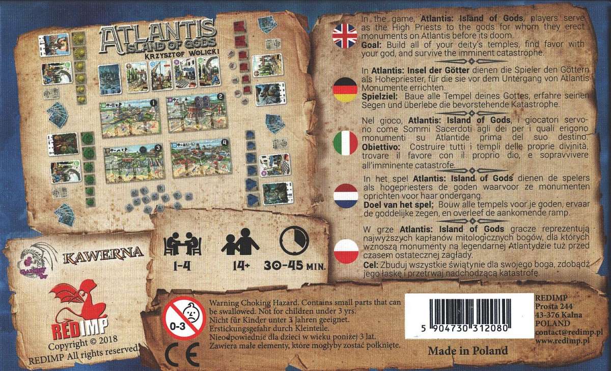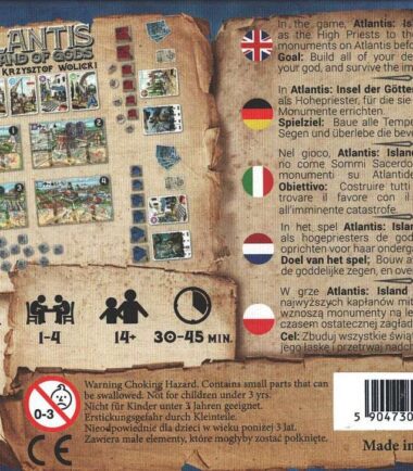 Στο Atlantis: Island of Gods, οι παίκτες είναι οι ανώτατοι ιερείς των μυθολογικών θεών, για τους οποίους υψώνουν μνημεία στο μυθικό νησί της Ατλαντίδας λίγο πριν τον αφανισμό του. Πρόκειται για ένα λογικό παιχνίδι με κάρτες, όπου υπάρχουν τέσσερις ταμπλό που αναπαριστούν τις περιοχές της Ατλαντίδας.