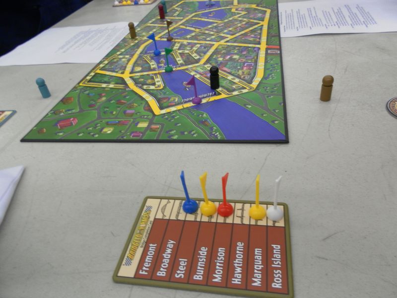 Each round, players arrange for transportation by placing coordinators on the transportation mode or special action of their choice. Next, the players choose a transportation mode and move their racer through the streets, trying to be the first to cross a bridge and pick up its flag. The flag is placed on the player’s Bridge Completion card and the first person to collect all eight flags wins the race.