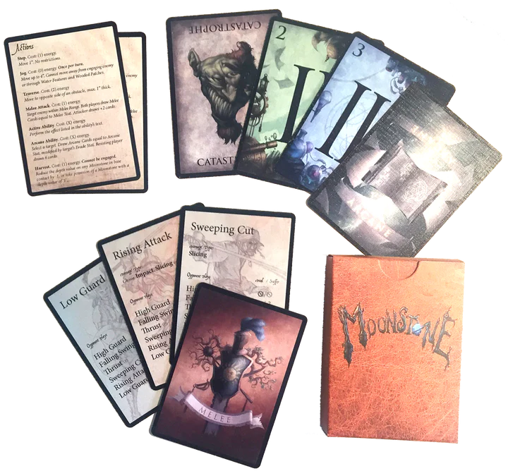 - 1 x Moonstone Card Deck (18 Melee Cards, 21 Arcane Cards and 2 Quick reference cards)