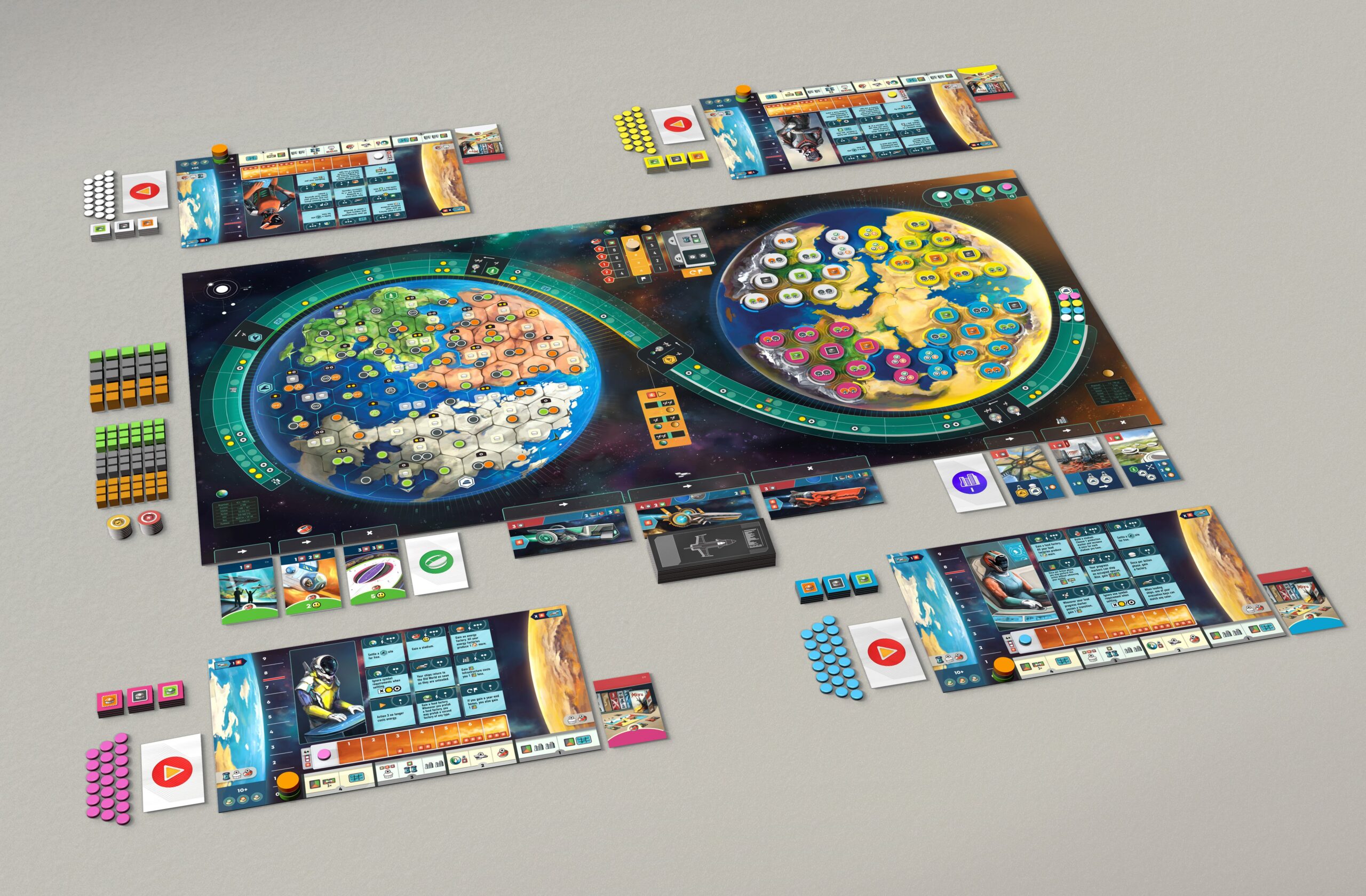You start the game with a full functioning economy, and over the course of play, you must dismantle that economy and move it. Income on the old planet shrinks over time, and production probably won’t be much better until you establish yourself on the new planet and kick things into action. Resources can’t be mixed across the planets, so you need to take special care with your planning.