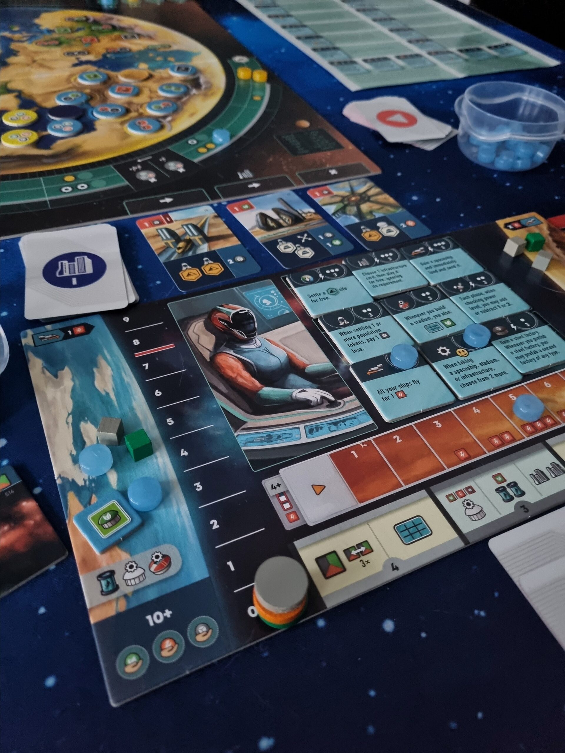 To do this, you choose actions from the player board, with the expert variant adding cards to your hand that allow you to choose additional actions and combine them. Each action has its own value, and the sum of these actions is important for an “end of the round” bonus. Additionally, players move their markers along the orbital track based on the value of their actions.
