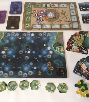 A game session takes you through a Ship Management phase (using a large binder with printed sleeves) in which you choose your destination for your ship then research technologies, produce equipment, recruit crewmembers and resolve situations, and then commence a Planetary Exploration phase. During said Planetary Exploration phase you will proceed with a daring landing procedure with your Lander, explore the planet for information or resources, fighting back a barrage of threats as well as a running timer of supplies depletion before you have to run back to the Lander to lift off back to ISS Vanguard. What follows is the remainder of the Ship Management phase, which takes you through unloading discoveries and resources from the Lander, healing or memorialising crewmembers and taking apart the game board and recording changes to the planet on which you’ve just conducted your Planetary Exploration on, preserving its status for when you will want or need to return to it.