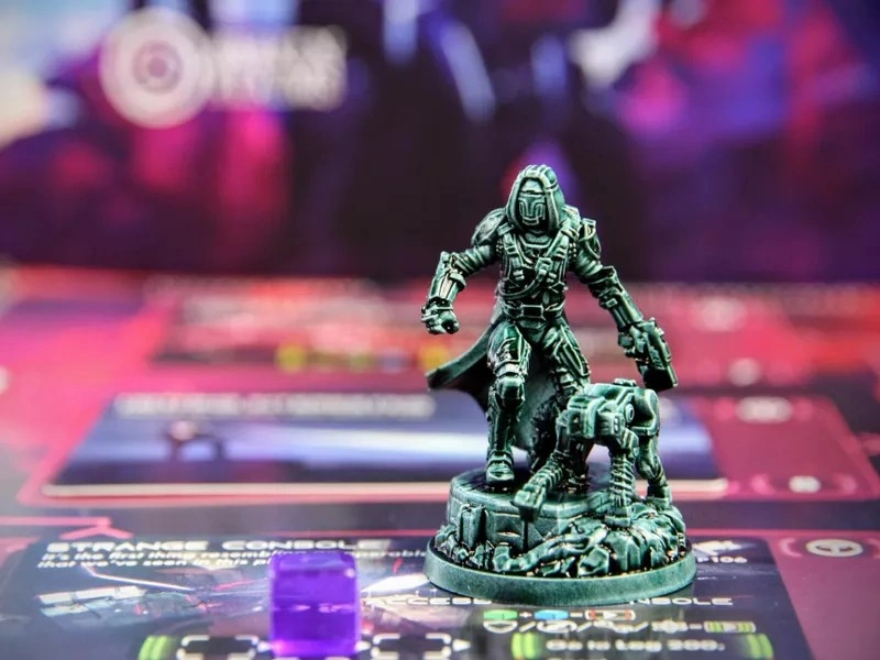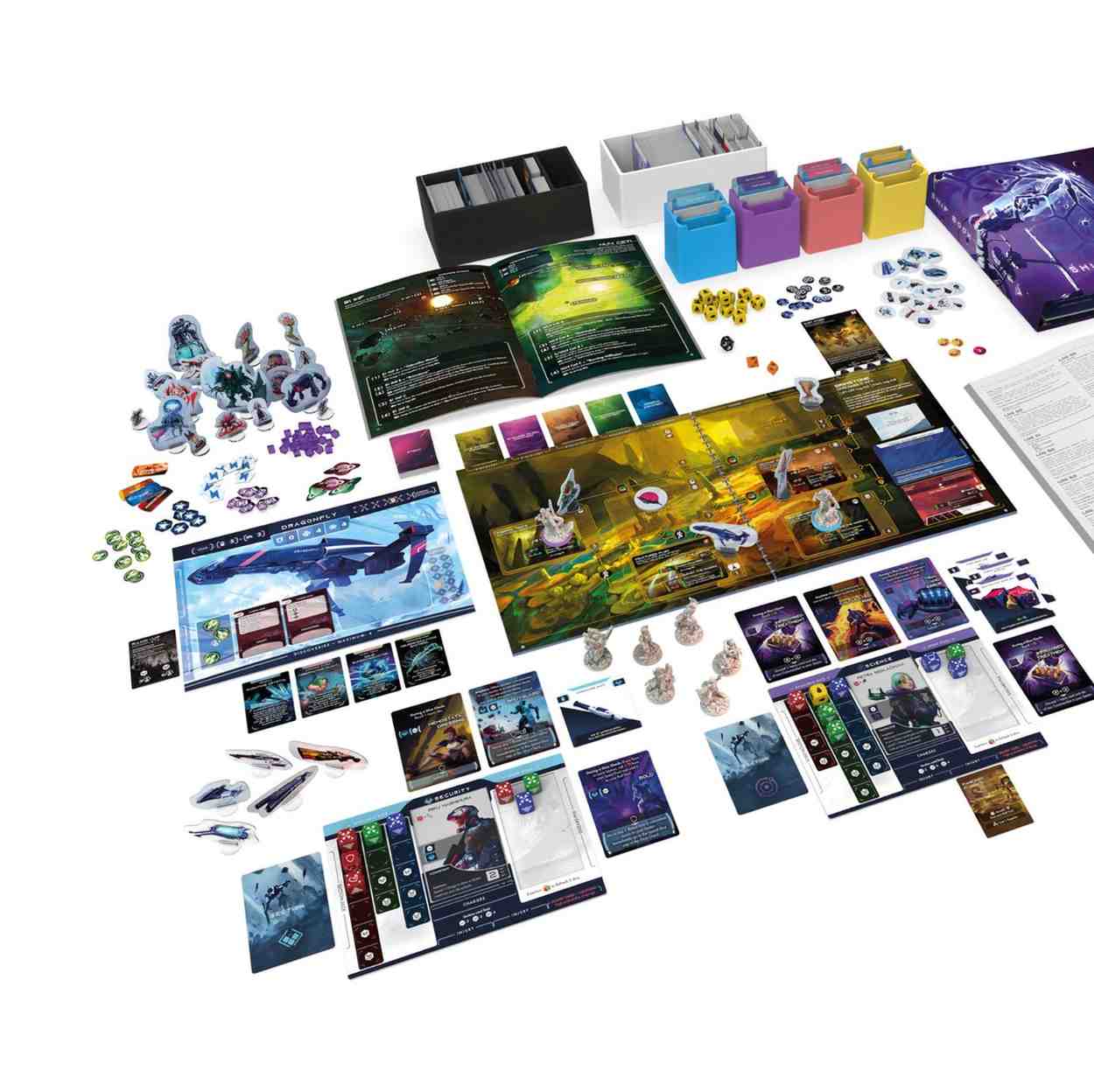A game session takes you through a Ship Management phase (using a large binder with printed sleeves) in which you choose your destination for your ship then research technologies, produce equipment, recruit crewmembers and resolve situations, and then commence a Planetary Exploration phase. During said Planetary Exploration phase you will proceed with a daring landing procedure with your Lander, explore the planet for information or resources, fighting back a barrage of threats as well as a running timer of supplies depletion before you have to run back to the Lander to lift off back to ISS Vanguard. What follows is the remainder of the Ship Management phase, which takes you through unloading discoveries and resources from the Lander, healing or memorialising crewmembers and taking apart the game board and recording changes to the planet on which you’ve just conducted your Planetary Exploration on, preserving its status for when you will want or need to return to it.