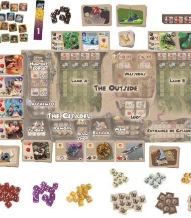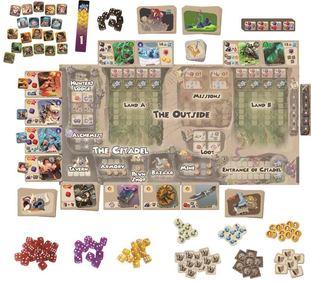 Your mercenaries provide you with dice, which you will use to take actions using a “worker-placement” mechanic. In the Citadel, your dice allow you to improve your clan, acquiring hunting tools, shields, potions, venoms, mercenaries, and more. The timing of your dice placement and the type of dice you use affects both yourself and other players.