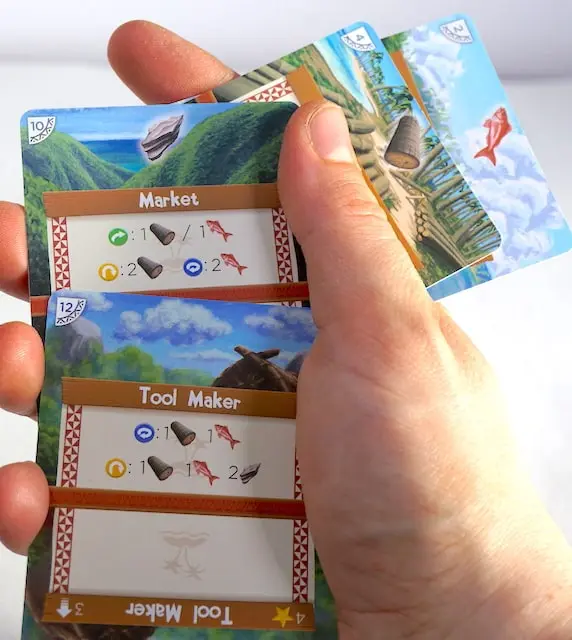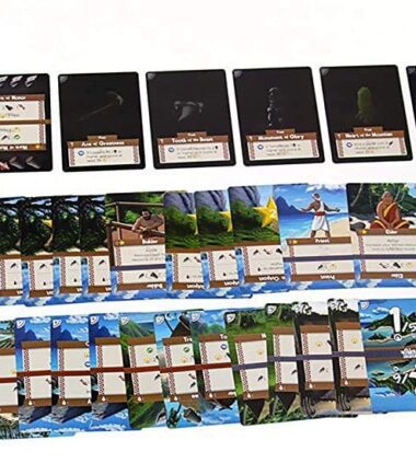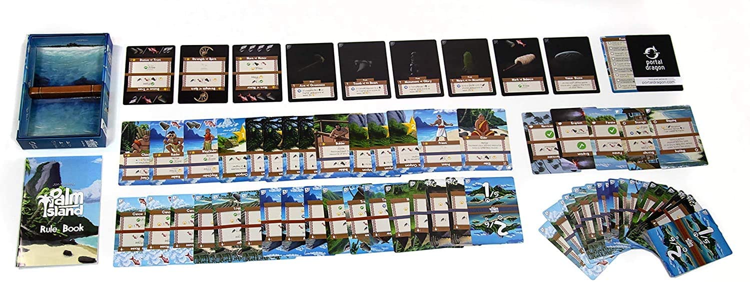 Using a deck-transforming mechanic, a player uses just 17 cards over 8 rounds to shape their island and overcome its unique challenges. Store resources to pay for upgrades and upgrade buildings to access new abilities. Each decision you make will alter your village from round to round. Complete your objectives within 8 rounds and calculate your score. Palm Island is a solo game with multiplayer variants. The game comes with enough cards for 2 players but multiple games can be combined to support even more.