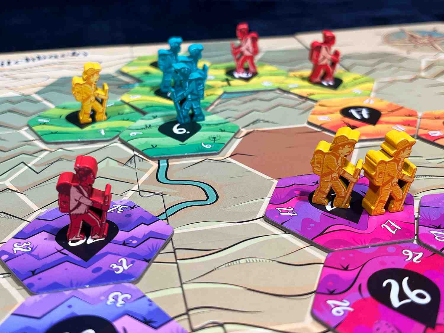 In Connect37, players place tiles numbered 1 to 37 into a hexagonal grid. When they place a tile, they may also place one of their chips onto it. At the end of the game, players check for groups of tiles on the board with consecutive numbers such that you can trace a sequential path; any player chips on these tiles are worth points. The player with the most points wins.