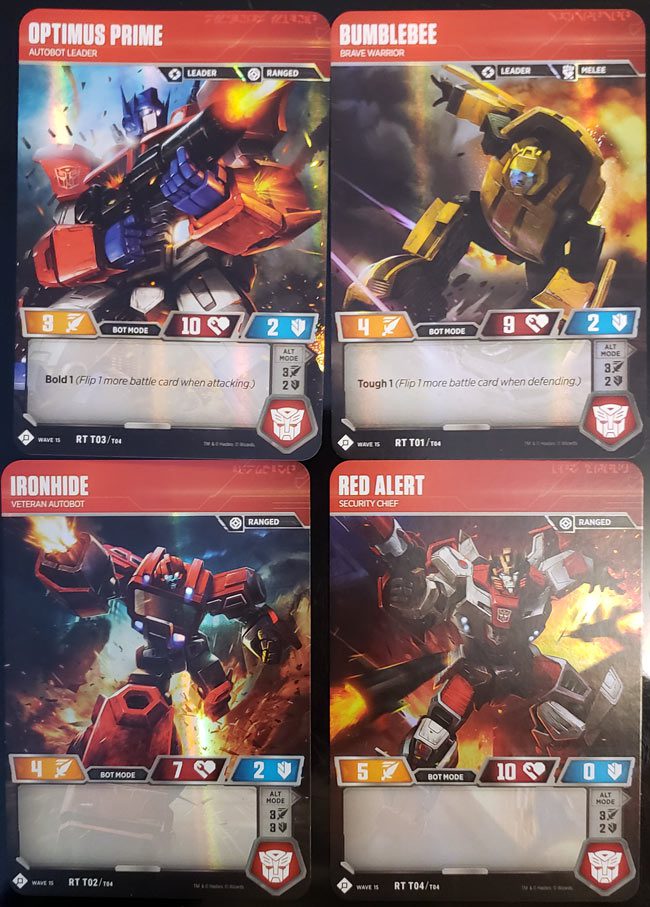 Οι παίκτες ενώνουν τις δυνάμεις τους με τους Bumblebee, Optimus Prime, Ironhide, και Red Alert σε αυτό το Autobots Starter Set. Με το Autobots Starter Set, 2 παίκτες μπορούν να ξεκινήσουν να παίζουν απευθείας το παιχνίδι, παίζοντας με ομάδες των 2 Character Cards ο καθένας και χωρίζοντας ή μοιράζοντας το deck των Battle Cards. Εναλλακτικά, 1 παίκτης μπορεί να χρησιμοποιήσει τις 4 Character Cards και τις 40 Battle Cards για full gameplay. Κάθε Autobot Starter Set περιλαμβάνει τις παρακάτω κάρτες.