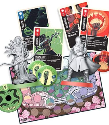 Battle of Legends, Volume One features four heroes. King Arthur sacrifices cards to power up his attacks and gets some timely assistance from Merlin’s magic. Alice is back from Wonderland with a giant vorpal blade and the Jabberwock by her side as she grows and shrinks to gain advantages on attack and defense. Medusa is happy to attack from range and let her harpies hound you, but just one devastating glance could end the battle quickly. Sinbad grows in power as he gains experience on each of his voyages.